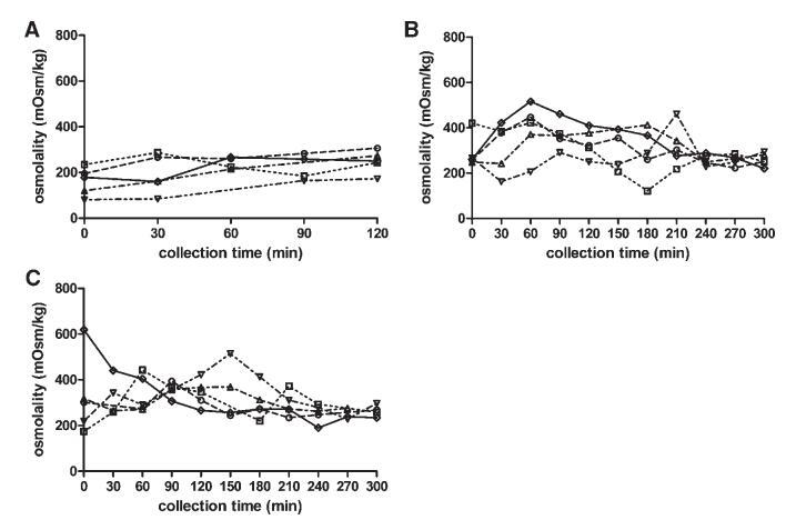圖5。在禁食(A)、喂食(B)和富含脂肪的喂食(C)狀態(tài)HIF中,滲透壓(mOsm/kg)隨餐后給藥時間的變化。(--?--)主題1(··?··)主題2,(·–·)△·–·)主題3,(·-·▽·–·)主題4,(-◇–)科目5。