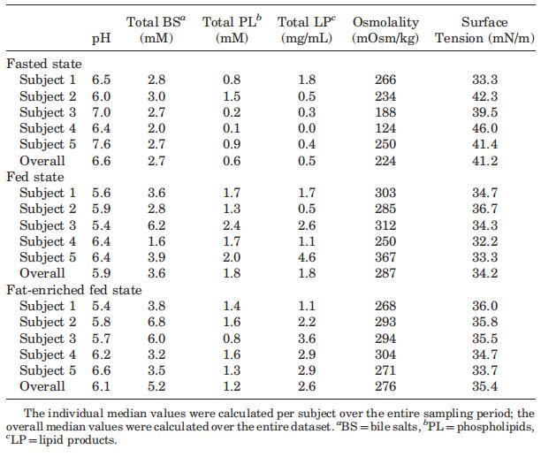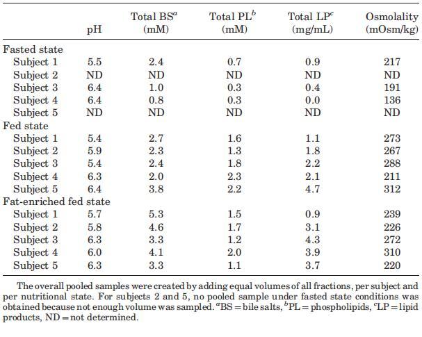 在本篇文章中,人類十二指腸內(nèi)容物在進食后的一段時間內(nèi)就幾種不同的腸道參數(shù)進行了表征,包括pH值、脂解產(chǎn)物、膽鹽、磷脂、滲透壓和表面張力。據(jù)我們所知,之前從未進行過攝入不同營養(yǎng)成分膳食后十二指腸液的受試者內(nèi)表征。由于研究方案可能在多個方面有所不同,并且由于不同類型的試驗餐在整個文獻的不同研究中使用,結(jié)果的比較并不總是簡單的。上述結(jié)果清楚地說明了所有檢查的腔內(nèi)參數(shù)在個體之間的高度可變性。此外,這些參數(shù)隨時間變化的波動增加了復(fù)雜性。因此,不能假設(shè)管腔內(nèi)成分隨時間的具體趨勢。這意味著餐后腸道內(nèi)容物的特征不容易在每個參數(shù)的單個值或時間曲線中呈現(xiàn);主體內(nèi)和/或主體間變化的重要性不會被提出。數(shù)據(jù)表明,通過報告單一代表性值,可變性將被掩蓋;匯集的HIF樣本以及計算的中隔的腔內(nèi)參數(shù)值通常與文獻中報告的典型值一致,這一事實證實了這一點。作為一個實際的折衷方案,最近有人提議使用三種不同的模擬腸液來表示餐后腸道環(huán)境。40腔內(nèi)參數(shù)值的變化可能是一組因素的結(jié)果,包括可變的胃排空、沿胃腸道的擴散、同時進行的消化和吸收以及不均勻分布的腸道內(nèi)容物。腸道液體可能分布到水袋28是最近的觀察結(jié)果,需要進一步研究。鑒于本研究中觀察到的變異性,可以建議增加志愿者人數(shù)。然而,估計用于檢測研究中每個物理化學(xué)參數(shù)存在差異的最小受試者人數(shù)并不容易,因為可變性水平隨參數(shù)而變化。