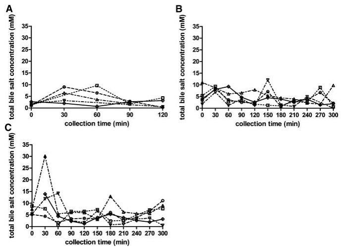 圖3。在禁食(A)、喂食(B)和高脂喂食(C)狀態(tài)HIF中,總膽汁鹽濃度(mM)隨餐后給藥時間的變化。(--?--)主題1(··?··)主題2,(·–·)△·–·)主題3,(·-·▽·–·)主題4,(-◇–)科目5。