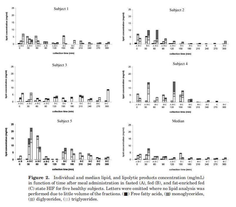 對于四名受試者(S2、S3、S4、S5),在禁食狀態(tài)HIF中發(fā)現(xiàn)微量脂質(zhì)(平均0.4?0.3 mg/mL),這與Armand等人12報告的受試者1十二指腸吸出物中的禁食水平0.6 mg/mL相符,禁食狀態(tài)下的脂質(zhì)濃度等于或高于30-120分鐘期間在喂食和富含脂肪的喂食狀態(tài)下測定的濃度(圖2)。這一觀察的可能原因可能與胃滯留時間和/或小腸上皮細胞的周轉(zhuǎn)率有關(guān),從而釋放膜脂。在喂食和富含脂肪的喂食狀態(tài)之間,根據(jù)個體特征,沒有發(fā)現(xiàn)實質(zhì)性差異。然而,中位數(shù)曲線顯示,進食30分鐘后,在高脂肪喂養(yǎng)狀態(tài)下,總脂質(zhì)濃度顯著增加。由于沒有觀察到脂質(zhì)產(chǎn)物在管腔內(nèi)出現(xiàn)延遲,因此可以得出結(jié)論,服用液體膳食的脂肪含量的應(yīng)用差異不會改變胃排空。先前已經(jīng)證明,給予恒河猴的碳水化合物、蛋白質(zhì)和脂肪等熱量負荷產(chǎn)生了相似的胃排空率,這表明胃排空是根據(jù)膳食的熱量密度進行調(diào)節(jié)的,而不管其營養(yǎng)成分如何。32
