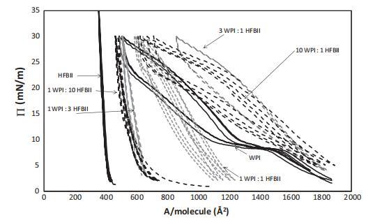 圖1。純蛋白質(zhì)系統(tǒng)WPI(右)和HFBII(左)以及口糧WPI:HFBII為10:1、3:1、1:1、1:3和1:10的混合系統(tǒng)的表面壓力等溫線。