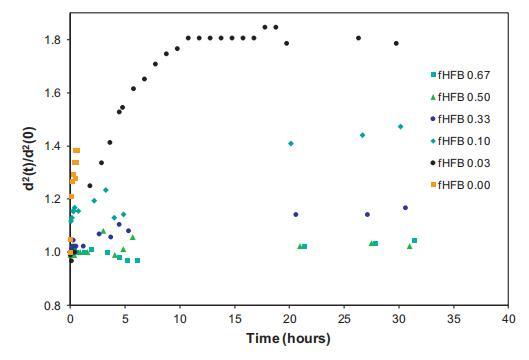 氣泡尺寸隨時間的相對增加如圖9所示,表示為d2(t)/d2(0)??紤]到環(huán)境充氣樣品的泡沫穩(wěn)定性,對于純HFBII系統(tǒng),在本實驗期間未發(fā)現(xiàn)平均氣泡尺寸的顯著變化,表明幾乎不可能發(fā)生任何歧化。在純WPI的情況下,可以發(fā)現(xiàn)氣泡尺寸急劇增加,表明對歧化的穩(wěn)定性較差。在混合情況下,隨著fHFBII的增加,我們可以看到氣泡尺寸穩(wěn)定性增加的趨勢。我們可以粗略地說,當fHFBII<0.2時,氣泡大小的初始演化在很大程度上取決于WPI。然而,當fHFBII>0.2時,HFBII的存在控制泡沫穩(wěn)定性。這與在朗繆爾槽中觀察到的初始氣泡大小和吸附層的趨勢非常一致。