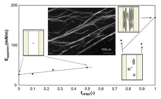圖2。表觀模量作為擴散層HFBII分數(shù)的函數(shù),以及槽屏障之間界面上褶皺斑塊的圖示。右邊是純HFBII層的一個褶皺斑的顯微鏡照片。
