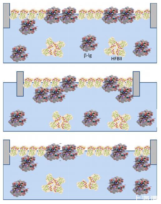 圖7。重復壓縮和膨脹后HFBII:WPI混合層結(jié)構(gòu)形成示意圖。請注意,乳清蛋白的主要成分BLG僅在此處顯示。壓縮:BLG的一部分從表面排出,形成一個子層。膨脹:BLG的一部分停留在亞表層,而另一部分可能重新吸附到主層。頂面存在HFBII的凈濃度。