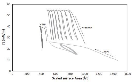 圖4。?/A-純HFBII、純WPI及其1:10混合物的吸附系統(tǒng)的等溫線,所有這些系統(tǒng)的總蛋白質(zhì)濃度均為0.1 mg/ml。等溫線包括第一個壓縮/膨脹循環(huán)和5個滯后環(huán)。將HFBII和WPI的表面積縮放至攤鋪系統(tǒng)曲線中彎曲點的出現(xiàn),對應于表面的明顯緊密堆積過渡(圖1)。