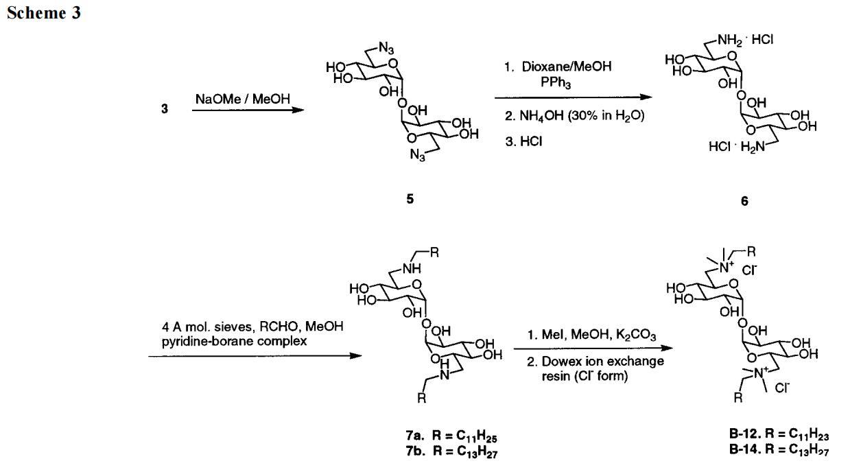 方案2和方案3以及實驗部分詳述了我們獲得A系列和B系列海藻糖雙子的方法。另外幾條評論有助于美化這一信息。B型海藻糖雙子最明顯的先驗途徑是用長鏈叔胺直接取代2的甲苯磺?;鶊F。盡管沿著這些路線進行了多次嘗試,但只獲得了分解產(chǎn)物或起始材料。然而,如方案2所示,我們成功地用疊氮化合物取代了2的兩個甲苯磺?;?,得到了3。此處采用文獻程序28,但出于安全考慮,HMPA被DMPU取代作為溶劑。然后,雙疊氮化物3經(jīng)過Staudinger反應25,29,在一個步驟中得到長鏈雙酰胺4a-g,而該長鏈雙酰胺4a-g只需脫保護即可獲得a系列雙子。在方案3中,脫保護糖5的疊氮化物還原將化合物轉化為二伯胺鹽酸鹽6。長鏈醛與6和吡啶硼烷絡合物30的還原胺化得到海藻糖衍生物7。使用NaBH3-CN作為還原劑,該反應的產(chǎn)率很低。在用甲基碘化物將7甲基化,然后進行離子交換(以促進純化和提高溶解性)之后,我們得到了B系列海藻糖雙子。