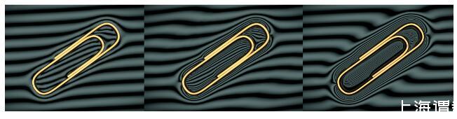在這個例子中我們成功使密度大于水的回形針漂浮在水面上,水面下面的條狀背景會因?yàn)樗娴膹澢冃?,從左到右回形針的密度逐漸增大,中間條紋的密度也在逐漸增加。在最右邊的場景中,回形針的密度達(dá)到了7.9 g/cm^3(金屬鐵的密度),是水密度的將近8倍,但是依然可以依靠表面張力漂浮起來,得到的條紋分布與真實(shí)圖片最為接近。