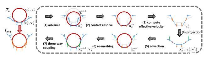 我們的耦合系統(tǒng)分為三個部分:流體,表面層,固體。流體部分我們采用傳統(tǒng)的歐拉網(wǎng)格的模擬方法,在交錯網(wǎng)格(Staggered Grid)上用算符分離的方法求解離散不可壓的Navier Stokes方程。固體部分采用傳統(tǒng)的拉格朗日方法求解牛頓方程。我們的主要貢獻(xiàn)在于在流體與固體之間插入了一層有質(zhì)量、有厚度的流體表面層,這個表面層直接對應(yīng)我們上面介紹的流體表面分子稀疏的部分。因?yàn)檫@個表面層非常薄,我們可以使用帶虛擬厚度的單層三角網(wǎng)格來表示,然后在這個表面層上施加表面張力勢能。為了將這三個部分耦合起來,我們在表面層和背景網(wǎng)格、固體和背景網(wǎng)格之間定義了速度的插值矩陣,同時將流體的壓強(qiáng)作用在表面層和固體上,以及將表面張力作用在固體上,這樣我們將這三部分寫進(jìn)一個三相耦合方程里進(jìn)行統(tǒng)一求解和更新。最終我們算法的流程如下: