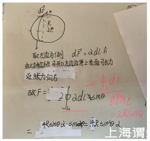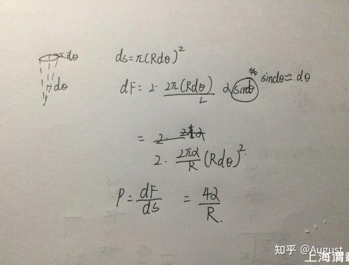 這個(gè)張力公式是普遍的張力公式,肥皂泡的不同部位L是不同的,將肥皂泡任意切成兩半,表面張力計(jì)算如下(正因?yàn)榉试砼莸姆指罘绞讲煌吔绲谋砻鎻埩Σ煌?,所以一般肥皂泡我們?jì)算其在單位面積上的總力,然后用壓力的概念處理相關(guān)問(wèn)題)