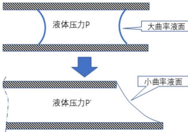 但是當(dāng)我們向著玻璃縫隙滴幾滴水,哪怕只是很少的幾滴,它們之間就不再牢固了,隨著水的不斷滴入,最后就不可避免地分開了。這是因?yàn)榈稳胨粩噙M(jìn)入縫隙,最后就會(huì)破壞掉前面所述的曲率很大的液面,導(dǎo)致液體壓力與外界氣壓的差迅速降低,于是它們就無法繼續(xù)沾在一起了。這個(gè)過程可以圖示如下: