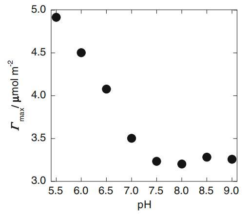 其中CS、R和T分別為表面活性劑總濃度、氣體常數(shù)和溫度。由于所有樣品溶液都含有過量的鈉鹽作為緩沖液并保持在恒定pH值,因此i值(濃度隨表面活性劑濃度變化的離子種類數(shù))取為1。圖5中繪制了最大值與pH值的關(guān)系圖。最大值在小于7.3的pH值下顯著增加,與cmc/C20比值的值相同。這些結(jié)果肯定表明,當pH值降至7.3以下時,在溶液表面用H+替換SLAS的Na+,也就是說,在pH值>7.3時,NDO癸?;“彼彡庪x子的反陽離子(LAS?)是空氣-水界面處的所有Na+。因此,估計了H+LAS的pKa值?另一方面,在含水體中,我們根據(jù)不同SLAS濃度下的pH值,確定了含水體相中HLAS的pKa值為3.3,該pH值在氮氣鼓泡的去火純水中。雖然我們還無法確定組裝的HLA的確切pKa值,因為尚未獲得HLA的最大值,但毫無疑問,其值大于含水體相中HLA單體的值3.3。一些文獻也報道了自組裝過程中pKa值的增加[12,13]。