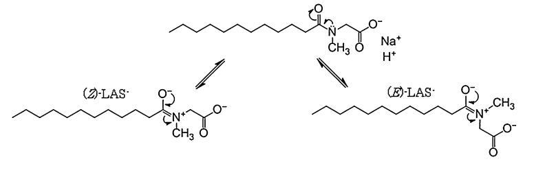 Bordes等人研究了氫鍵對甘氨酸鹽和肌氨酸鹽自組裝的影響[17]。Gad等人研究了具有不同碳鏈長度的N-?;“彼猁}的界面張力[3]。還對含有SLA的二元混合物與Gemini表面活性劑[18]和陽離子聚合物[19]進行了一些界面研究。然而,這些研究沒有考慮它們的pH影響。Tsubone等人在pH值為10.5[20]時對SLA進行了界面張力測量。然而,SLAS水溶液的界面張力在很大程度上取決于pH,在膠束前和膠束后區(qū)域中,當pH小于約7時,其值顯著下降。cmc和C20在較低pH下也會降低,但cmc/C20比在pH<7.3時增加。該比值的增加通常意味著親水頭的尺寸增加和/或與反陽離子的締合增加。在pH<7.3時,Γmax也急劇增加。這些結(jié)果清楚地表明,在空氣-水界面的較低pH區(qū)域,SLA的Na+陽離子被H+取代。向溶液中加入Tl+,證實LAS的界面張力?并且它們以H+<Na+的順序增加,這與這些結(jié)果一致。此外,我們使用1H-NMR和13CNMR研究了D2O和CD3OD中HLA和SLA的結(jié)構(gòu)差異。根據(jù)這些結(jié)果,例如,來自LAS親水部分中1小時的所有信號?可以想象,HLA和SLA都具有共振結(jié)構(gòu),(Z)-LAS?和(E)-LAS?,如圖9所示。通過NMR[21,22]的膠束化也報告了這些SLAS異構(gòu)體的存在。根據(jù)分裂峰的積分比,Z/E形式的豐度比確定為SLA為1:1,HLA為2:1。由于E型比Z型體積大,這可能是Γmax隨pH值增加而減小的第二個原因,直到pH值為7.3。另一方面,除了RB的各向異性(在pH<7時明顯增加)外,含水體中的膠束性質(zhì)對pH的依賴性小于界面性質(zhì)。然而,在pH值降低時,聚集數(shù)和流體動力學(xué)半徑的小幅度增加趨勢以及膠束核的微極性的減小趨勢可以很好地解釋為LAS親水性頭基團之間的靜電力減小?由Na+到H+的反陽離子置換引起,與界面性質(zhì)的情況相同。雖然我們尚未確定界面和膠束中HLA的pKa值,但這些值應(yīng)大于水溶液中的pKa值(pKa,bulk=3.3);界面處的值可能略大于膠束中的值。pH<7時體積較小的Z型的增加也與膠束性質(zhì)相容,并可能與膠束親水部分附近RB各向異性的增加直接相關(guān)。