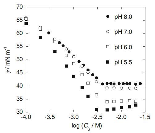 圖2界面張力(γ)與由50 mM磷酸鹽和硼酸鹽緩沖液控制的不同pH下總SLAS摩爾濃度(CS)的對數(shù)關(guān)系圖