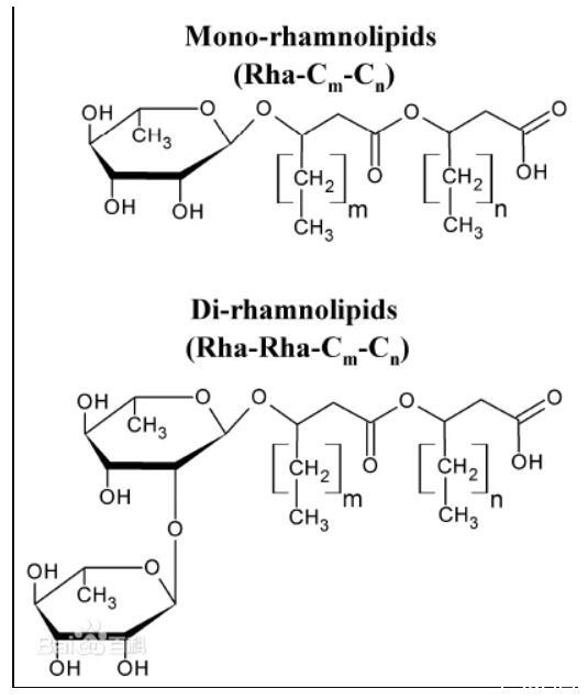 它們是假單孢菌在以正構(gòu)烷烴為唯一碳源的培養(yǎng)基時,得到的一種表面活性劑。如果假單孢菌在果糖或葡萄糖中生長,只能得到少量產(chǎn)物。一旦有鼠李糖脂生成,將有助于培養(yǎng)基中基質(zhì)烴的乳化,從而可刺激菌體生長,加速產(chǎn)物的生成。