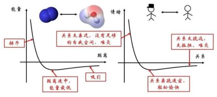在微觀世界存在著多種多樣的分子,比如上圖所示的氮?dú)馀c水分子。分子間組成的體系的勢能與分子間的距離有關(guān)。這種關(guān)系正如兩個人之間的關(guān)系,遠(yuǎn)了近了都不好。如果距離太近,彼此之間沒了自我空間,情緒會不穩(wěn)定,因此會產(chǎn)生相互排斥的作用;如果距離太遠(yuǎn),每個人都太孤獨(dú),便會相互思念,彼此吸引。當(dāng)彼此的距離恰到好處,便對應(yīng)著能量的最低點,較為穩(wěn)定。