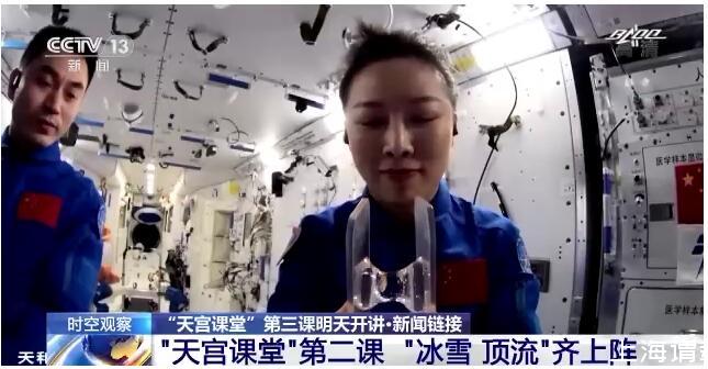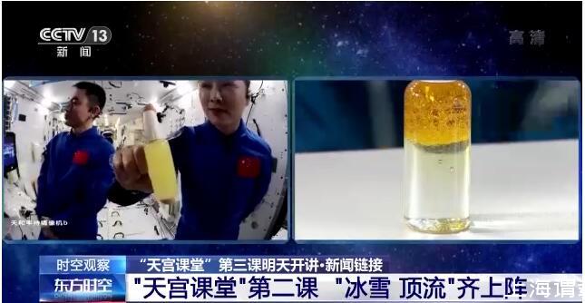 在約45分鐘的授課中,航天員演示了微重力環(huán)境下太空“冰雪”實驗、液橋演示實驗、水油分離實驗、太空拋物實驗,講解了實驗現(xiàn)象背后的科學原理,還展示了部分空間科學設施。