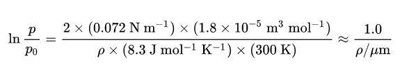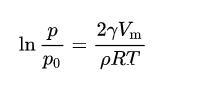 聽說公式會讓人不想看科普所以我只講這一個公式好了(x)其中,R是通用氣體常量,T是溫度,ρ是液滴表面的曲率半徑。p?是表面平整的液體原本的蒸氣壓,p是這個液滴的蒸氣壓。p?、表面張力γ、液體摩爾體積V_m對于同種溫度的同種液體可以認為近似是常量。把以上常量合并為常量C,所以在同樣溫度下,對于同種液體,可以得出如下的半定量關(guān)系: