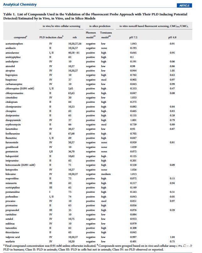 濃度依賴性。體內(nèi)研究中PLD的程度是劑量依賴性的。24,33在體外試驗(yàn)中,濃度控制可用于估計(jì)劑量依賴性。一組七種報(bào)告的PLD誘導(dǎo)劑分別以三種不同的濃度進(jìn)行了測(cè)試:910、91和9.1μM(圖4)。對(duì)于氯喹和酮康唑,要么它們?cè)?0 mM時(shí)不能完全溶解在DMSO中,要么在使用10 mM DMSO儲(chǔ)備液時(shí)與緩沖液混合后鹽析出來(lái),它們的最高濃度點(diǎn)被去除。所有化合物都表現(xiàn)出對(duì)CMC的濃度依賴性,以不同程度改變PLD誘導(dǎo)潛力。即使在910μM時(shí),芬氟拉明似乎也是一種弱誘導(dǎo)劑,而硫利達(dá)嗪在不同濃度之間顯示出顯著變化。根據(jù)該體外數(shù)據(jù),在9.1μM的最低濃度下,七種化合物中沒(méi)有一種似乎能夠誘導(dǎo)PLD。復(fù)合自聚合。與磷脂類似,大多數(shù)PLD誘導(dǎo)劑是兩親性的。盡管帶有不同的電荷跡象,但它們也可以聚集并形成膠束。拉貝洛爾20,34和奎尼丁35被報(bào)道為PLD誘導(dǎo)劑;然而,在所應(yīng)用的測(cè)試條件下,我們無(wú)法確定任何一種藥物脂質(zhì)復(fù)合物的CMC。獲得的RFU值等于或低于空白(含熒光探針但不含脂質(zhì)的化合物)中的值。進(jìn)一步研究了不同藥物濃度但沒(méi)有脂質(zhì)(0 mg/mL脂質(zhì)),并且在無(wú)脂質(zhì)測(cè)定緩沖液中,拉貝洛爾和奎寧的CMC值分別為26和20μM。這些CMC值遠(yuǎn)低于這些化合物在PLD篩選中的測(cè)試濃度,并且懷疑化合物的自聚集會(huì)干擾藥物脂質(zhì)復(fù)合物形成的檢測(cè),從而使CMCDL無(wú)法確定。