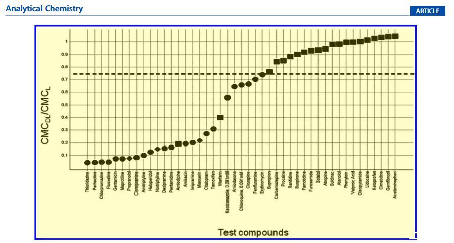 圖3.在pH 7.2的熒光測(cè)定中觀察到的CMC偏移(由藥物脂質(zhì)復(fù)合物(DL)的CMC和單獨(dú)的脂質(zhì)(L)的CMC之間的比率表示:CMCDL/CMCL)與體內(nèi)人體內(nèi)的比較體內(nèi)動(dòng)物或體外細(xì)胞PLD分析。CMCDL/CMCL的臨界值為0.75,將PLD誘導(dǎo)劑(b,體內(nèi)測(cè)定;[,細(xì)胞測(cè)定)與PLD非誘導(dǎo)劑(9)分開(kāi),只有兩個(gè)異常值:氨氯地平和華法林。