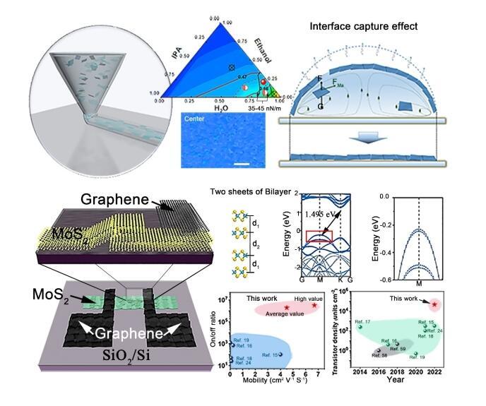 近日,化學(xué)所與清華大學(xué)、美國加州大學(xué)合作,提出了一種界面捕獲效應(yīng)打印策略。該策略使用低沸點水性超分散二維材料油墨,直寫打印二維半導(dǎo)體薄膜陣列,無需添加額外表面活性劑。具體而言,這一策略通過對剝離的半導(dǎo)體2H-MoS2納米片進(jìn)行分級離心,獲得了主要為雙層厚度的窄分布納米片;通過建立表面張力和組分比的三溶劑相圖,確定了合適的油墨溶劑。印刷超薄圖案(約3nm厚度)主要以單層或兩層的MoS2納米片連續(xù)均勻排列,并抑制了咖啡環(huán),空隙率較低(約4.9%)。研究使用商用石墨烯作為電極,制備的晶體管在室溫下顯示出6.7 cm2·V-1·s-1的遷移率和2×106的開關(guān)比,超過了此前印刷MoS2薄膜晶體管的性能?;诖?,科研人員制備了高密度(約47000個/cm2)印刷晶體管陣列。該界面捕獲效應(yīng)打印策略可應(yīng)用于其他2D材料,包括NbSe2、Bi2Se3和黑磷,為印刷二維材料電子器件提供了新方法和新思路。
