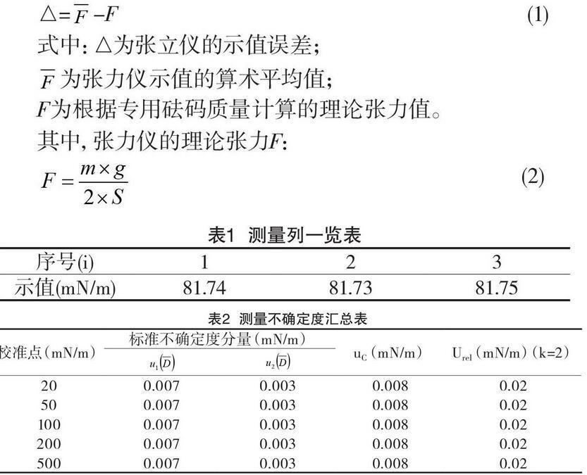 根據(jù)JJF 1464-2014《界面張力儀校準(zhǔn)規(guī)范》規(guī)定,張力儀的測(cè)量范圍為20~500mN/m,其測(cè)量不確定度見(jiàn)表2。