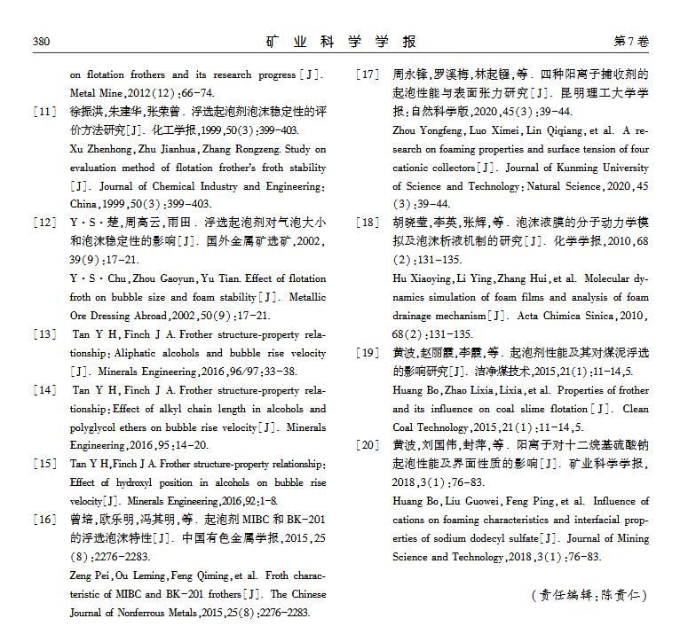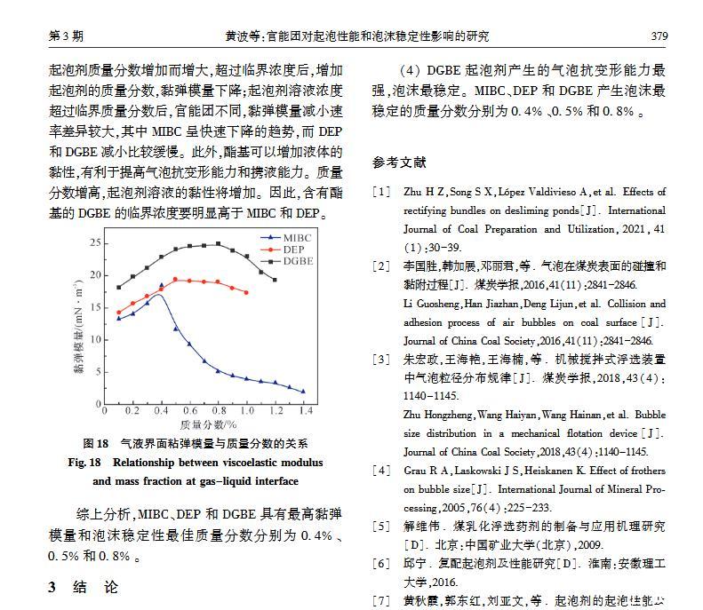 【摘要】:浮選是分離微細(xì)物料的重要方法,起泡劑類型和泡沫穩(wěn)定性顯著影響浮選效果。本文選取醇類(MIBC)、酯類(DEP)和醚醇類(DGBE)三種起泡劑,通過實(shí)驗(yàn)研究官能團(tuán)對(duì)起泡性能和泡沫穩(wěn)定性的影響。實(shí)驗(yàn)用Foamscan測定起泡劑溶液的起泡性能和泡沫穩(wěn)定性,用Tracker流變儀測定表面張力和氣液界面黏彈模量。研究結(jié)果表明:起泡速率隨表面張力的減小呈線性增大,當(dāng)氣液界面吸附起泡劑達(dá)到飽和時(shí)起泡速率最大,其中MIBC的起泡速率最高,DGBE最??;起泡劑濃度為臨界質(zhì)量分?jǐn)?shù)時(shí),起泡能力最大,MIBC、DEP和DGBE的臨界質(zhì)量分?jǐn)?shù)分別為1.1%、0.4%和0.8%;氣泡的大小隨溶液表面張力減小而減小,氣泡平均尺寸由大至小順序?yàn)椋篋GBEDEPMIBC;在泡沫穩(wěn)定性方面,醚醇類起泡劑最強(qiáng),醇類起泡劑最差,同時(shí)MIBC、DEP和DGBE質(zhì)量分?jǐn)?shù)分別為0.4%、0.5%和0.8%時(shí),起泡劑生成的泡沫最穩(wěn)定。