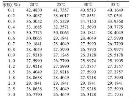 由表1可以明顯看出,同一溫度下,黃花敗醬皂甙的表面張力隨濃度的增大而顯著下降,同一濃度下隨溫度升高,表面張力下降。高溫時(shí)表面張力下降比較明顯,濃度為2.0%時(shí)表面張力不隨溫度變化而變化。cmc約為1%,σcmc約為(25~27)×10-3(N·m-1)。黃花敗醬皂甙符和表面活性劑的定義,濃度變化很小,表面張力下降很大下降到臨界膠束濃度再增加濃度表面張力也不下降。