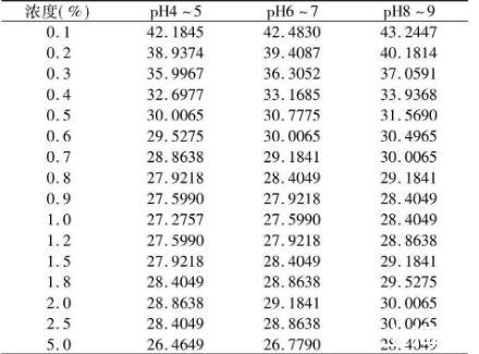 配制不同濃度的黃花敗醬皂甙水溶液并在不同溫度對其表面張力進(jìn)行研究及pH對其影響。結(jié)果如下。
