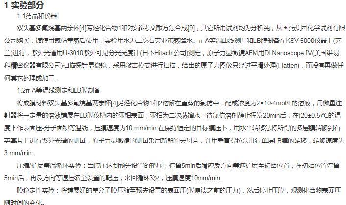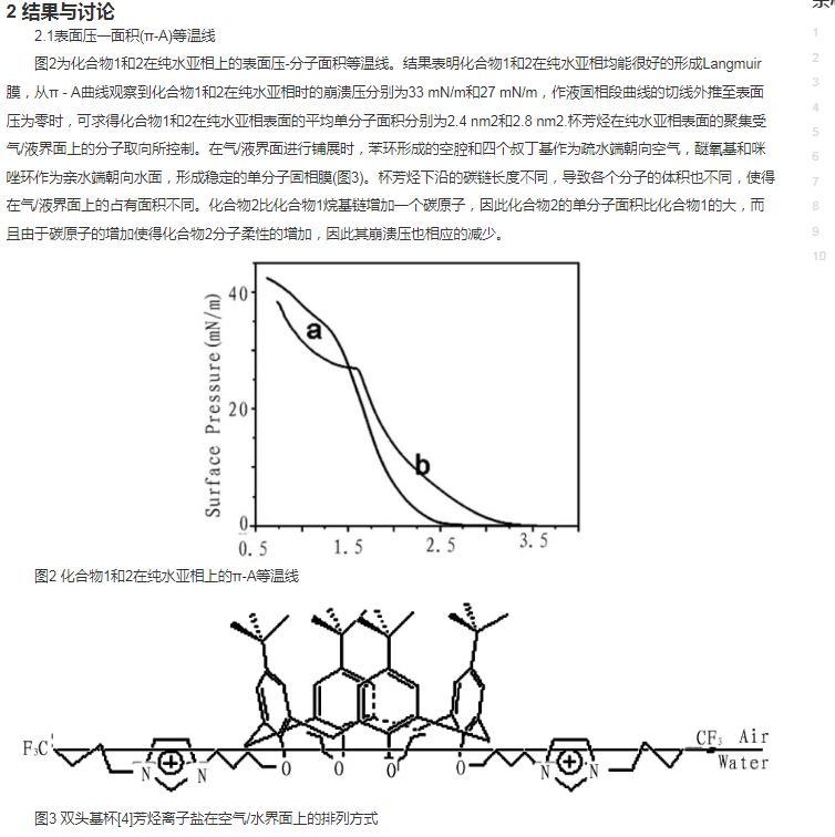 Langmuir-Blodgett膜技術(shù)(LB膜)是一種精確控制薄膜厚度和分子排列的單分子膜沉積技術(shù),即在水氣界面上能將成膜材料分子加以緊密有序地排列,形成單分子層,然后再轉(zhuǎn)移到固體襯底上的制膜技術(shù),利用該技術(shù)可以將功能化合物的光學(xué)、電磁學(xué)、分子識別與催化等性質(zhì)轉(zhuǎn)移到膜材料中。杯芳烴是繼環(huán)糊精、冠醚之后出現(xiàn)的第三代超分子主體分子,它具有空腔可調(diào)節(jié),構(gòu)象可變換,并易于化學(xué)改性和修飾等特點(diǎn),特別是對它進(jìn)行適當(dāng)修飾以后的化合物在材料化學(xué),配位化學(xué),生物化學(xué)等領(lǐng)域表現(xiàn)出潛在的應(yīng)用前景與研究價(jià)值?;谏鲜稣J(rèn)識最近我們合成了雙頭基多氟烷基兩親杯芳烴化合物1和2(圖1),并對該化合物在空氣/水相界面的成膜性能以及LB膜的結(jié)構(gòu)進(jìn)行了研究。