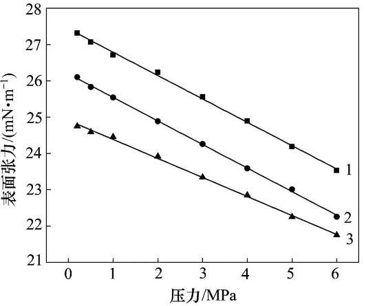 為了研究溫度和壓力對(duì)煙道氣?稠油平衡表面張力的影響,分別在80,100和120℃下進(jìn)行實(shí)驗(yàn),圖2所示為不同溫度下煙道氣?稠油平衡表面張力隨壓力變化曲線。由圖2可見:當(dāng)氣體壓力從0.2 MPa升高到6 MPa,在80℃時(shí),煙道氣?稠油表面張力由27.31 mN/m減小到23.53 mN/m,降低了13.84%;在100℃時(shí),煙道氣?稠油表面張力由26.10 mN/m減小到22.26 mN/m,降低了14.71%;在120℃時(shí),煙道氣?稠油表面張力由24.75 mN/m減小到21.75 mN/m,降低了12.12%。當(dāng)溫度一定時(shí),煙道氣?稠油系統(tǒng)的平衡表面張力隨著壓力的增大而減小,并呈較好的線性關(guān)系。這是因?yàn)闇囟纫欢〞r(shí),壓力增大,煙道氣在稠油中的溶解度增大,使得平衡表面張力減小。當(dāng)壓力一定時(shí),煙道氣?稠油系統(tǒng)的平衡表面張力隨溫度的升高而減小。這是因?yàn)闊煹罋獾闹饕煞质荖2,N2在稠油中的溶解度隨著溫度升高而增大。