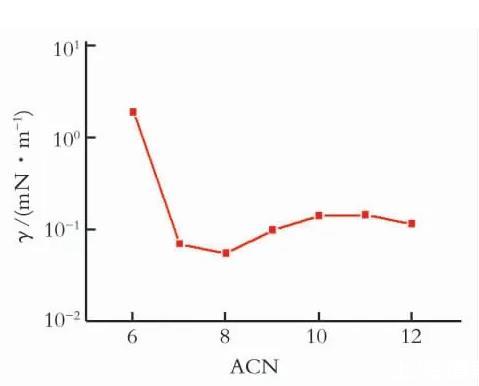 從圖2與表1可以看出,同樣條件下,甜菜堿與正構(gòu)烷烴間的界面張力遠(yuǎn)低于原油,說(shuō)明油相性質(zhì)對(duì)油水界面張力有關(guān)鍵的影響,可能是原油中降低界面張力能力不如甜菜堿的活性組分分子在界面上的存在造成原油界面張力較高。