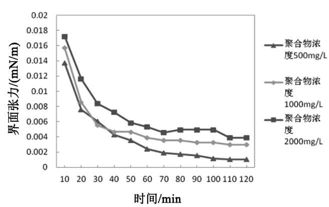 在石油磺酸鹽濃度為0.1%,模擬污水礦化度4200 mg/L,碳酸鈉濃度0.6%條件下,分別測定聚丙烯酰胺濃度為500、1000和2000 mg/L的復(fù)合體系隨時間變化的界面張力值,結(jié)果如圖2所示。