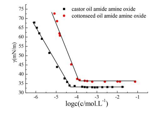 圖 4. 表面張力與水溶液摩爾濃度的對數(shù) 蓖麻油酰胺氧化胺和棉籽油酰胺氧化胺在 25攝氏度