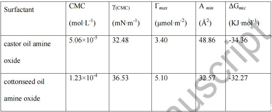由表2可知,蓖麻油酰胺氧化胺和棉籽油酰胺 氧化胺將水的表面張力降低到最小值約 在 5.06×10-5 mol/L 的濃度下為 32.48 mN/m,在 5.06×10-5 mol/L 的濃度下為 36.53 1.23×10-4 mol/L,表明它們的表面活性很高。 和....相比 一些已報道的氧化胺表面活性劑,[12] 如十六烷基二甲基 氧化胺、十八烷基二甲基氧化胺和椰油酰胺丙基二甲基胺 氧化物等,其CMC值通常在10-4范圍內(nèi) ~10-3 mol/L, 這些 CMC 值較低。 這可能是因為幾種酰胺的混合物 氧化胺具有協(xié)同增強的作用,提高了表面 活動總體上。 還可以發(fā)現(xiàn),蓖麻油的 CMC 和 γ(CMC) 值 酰胺氧化胺遠(yuǎn)低于棉籽油酰胺氧化胺,后者 可能是由于蓖麻油酰胺氧化胺中存在-OH。 [13] 在 另外,從表 2 中的數(shù)據(jù)可以看出,蓖麻油的Γmax 值 酰胺氧化胺低于棉籽油酰胺氧化胺,而 前者的Amin值大于后者。 這一結(jié)果可能歸因于 烷基鏈的長度。 此外,ΔGmic 的負(fù)值表明 9 在 25 oC 時,膠束化是自發(fā)的,這意味著這兩種天然植物油 酰胺胺氧化物在空氣-水界面有極好的吸收能力 在溶液中形成膠束。