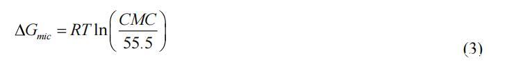 其中 R 是氣體常數(shù),NA 是阿伏伽德羅數(shù),T 是絕對溫度,并且 n 是溶質(zhì)種類的數(shù)量,我們可以將其設(shè)置為 1。 膠束化的自由能 (ΔGmic) 由等式 (3) 計算。